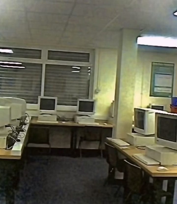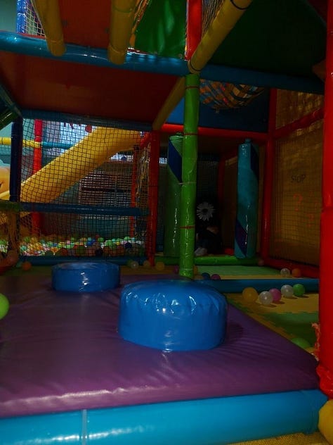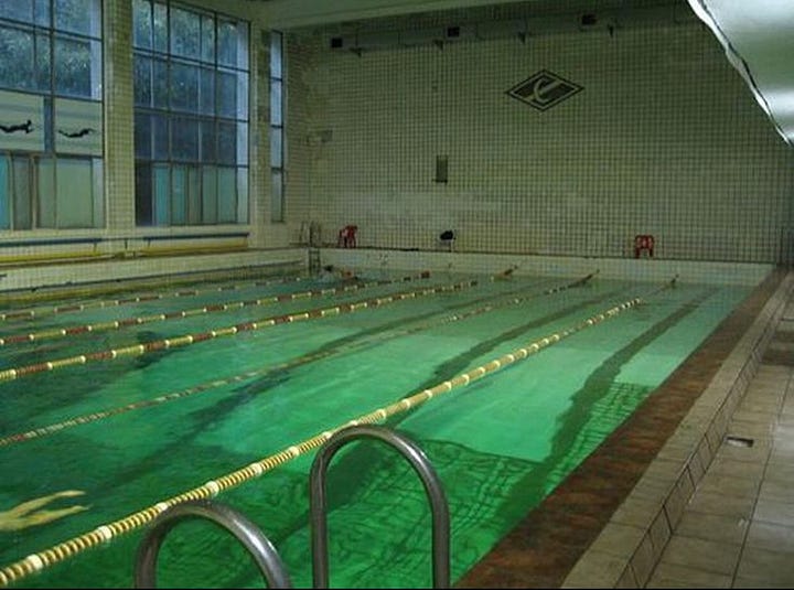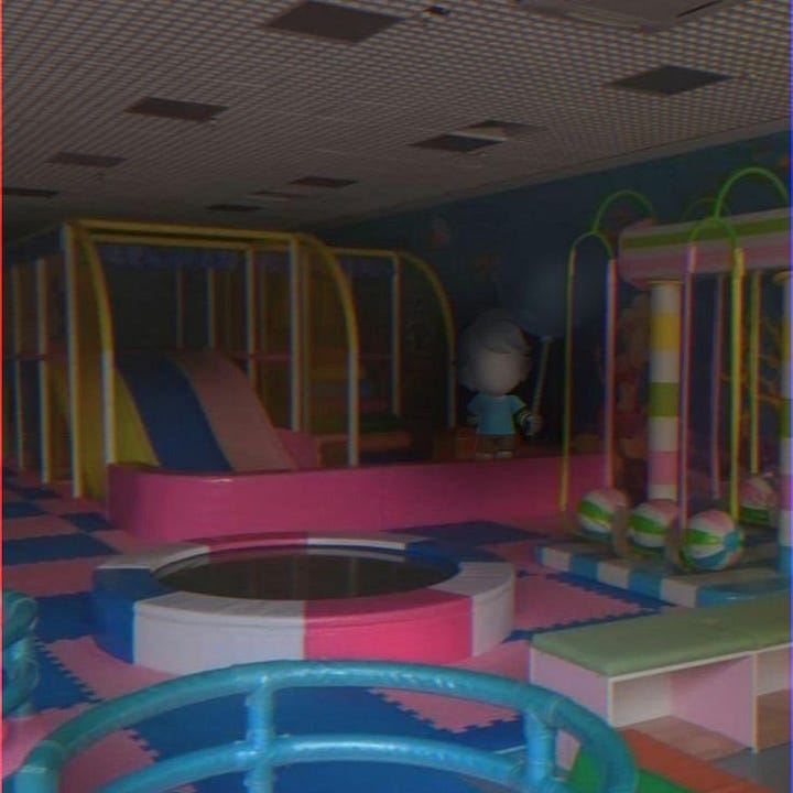 A significant chunk of the images summoned by a Pinterest search for Liminal Space features spaces reminiscent of some universal childhood. Think elementary schools, indoor play areas, swimming pools with slides, single-family home interiors from the nineties and early aughts. Many of these are dark and deserted, meaning they also fall into the previous category, but the childhood scenes give them a certain unsettling patina not present in the others.